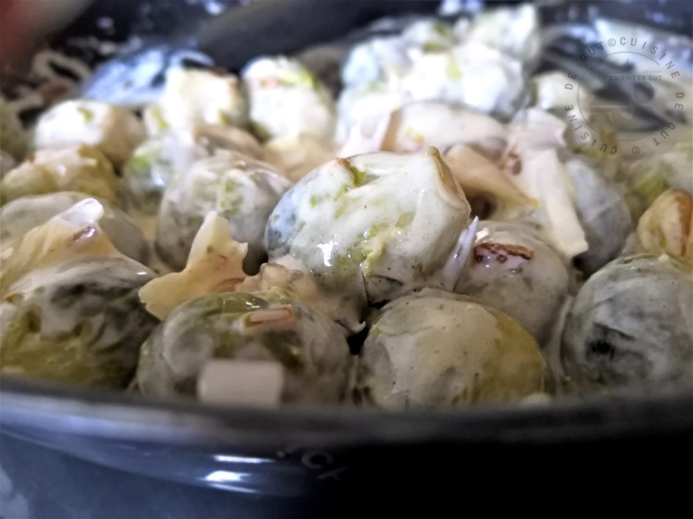 Je pense que je vous l’ai laissé entendre, j’ai beaucoup aimé cet accompagnement que j’ai servi avec des côtes de porc et avec un peu de cette délicieuse petite sauce. Je conseille fortement aux récalcitrants des choux de Bruxelles de refaire une tentative. Lorsqu’ils sont de saison les choux de Bruxelles ne sont pas très forts et cuisinés avec cette petite crème je doute fort que vous ne les aimiez pas ! je publie ce plat pour cuisinons de saison. Je te remercie de tout plein Samar, il n’y a pas que dans les gâteaux que tu fais des exploits !