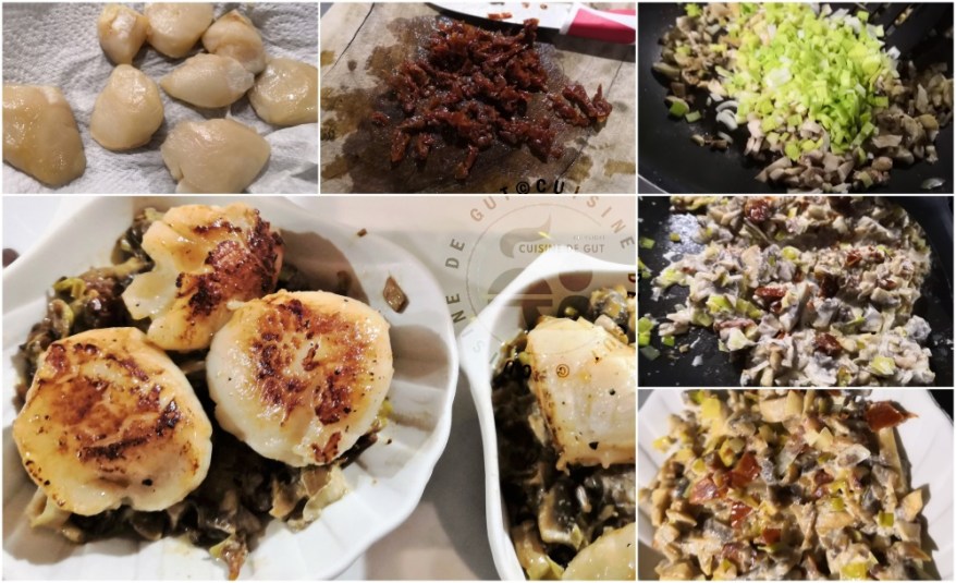 Noix de St-Jacques sur Duxelles, poireaux et tomates séchées