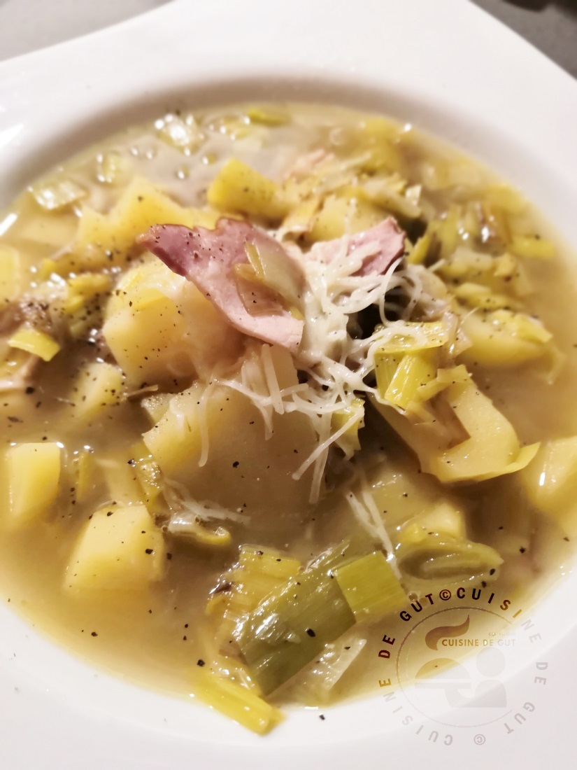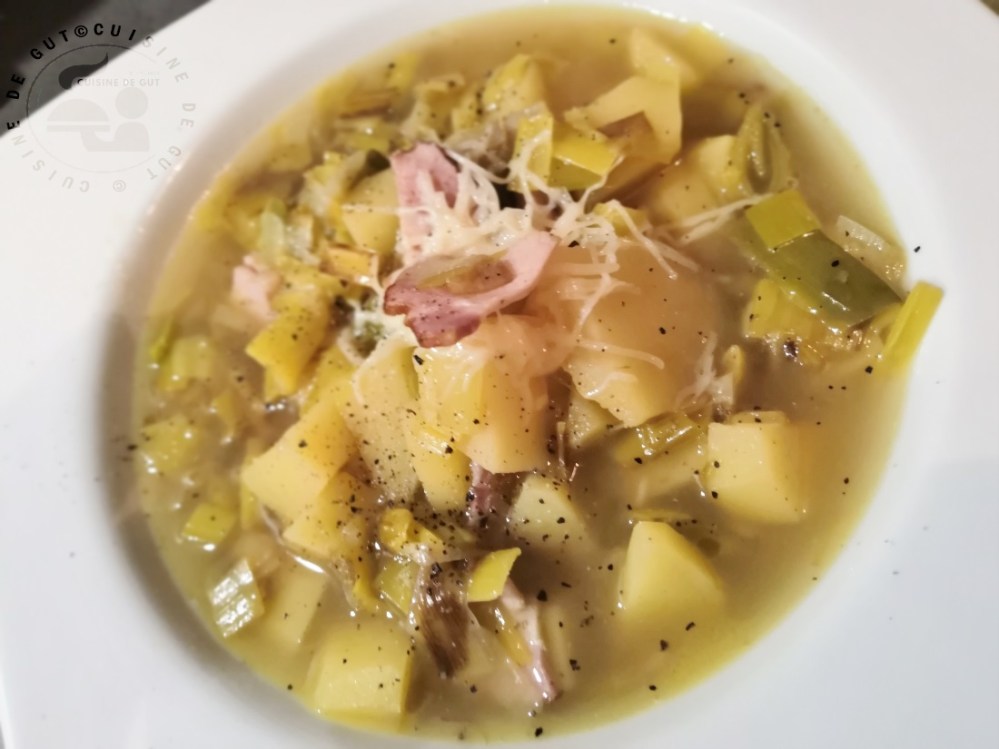 Aujourd’hui je vous propose un potage. Bien qu’il ne fasse toujours pas très froid chez moi ça aide bien lorsque l’on ne sait pas trop quoi faire à manger le soir ou lorsque l’on a fait un repas un peu copieux le midi. Pour une fois ce c’est pas un velouté puisque les morceaux sont gardés dans le potage. On a même pas besoin de mixer. Un vrai gain de temps et de vaisselle !! Les ingrédients sont plus que basiques puisqu’il s’agit d’une soupe de pommes de terre et poireaux, mais pas comme on la fait souvent puisque je fais d’abord revenir mes poireaux et mes pommes de terre dans une sauteuse avec du beurre. C’est une soupe que je fais depuis très très longtemps et même si depuis j’ai fait un nombre de potages variés c’est un des meilleurs potages que j’ai fais.