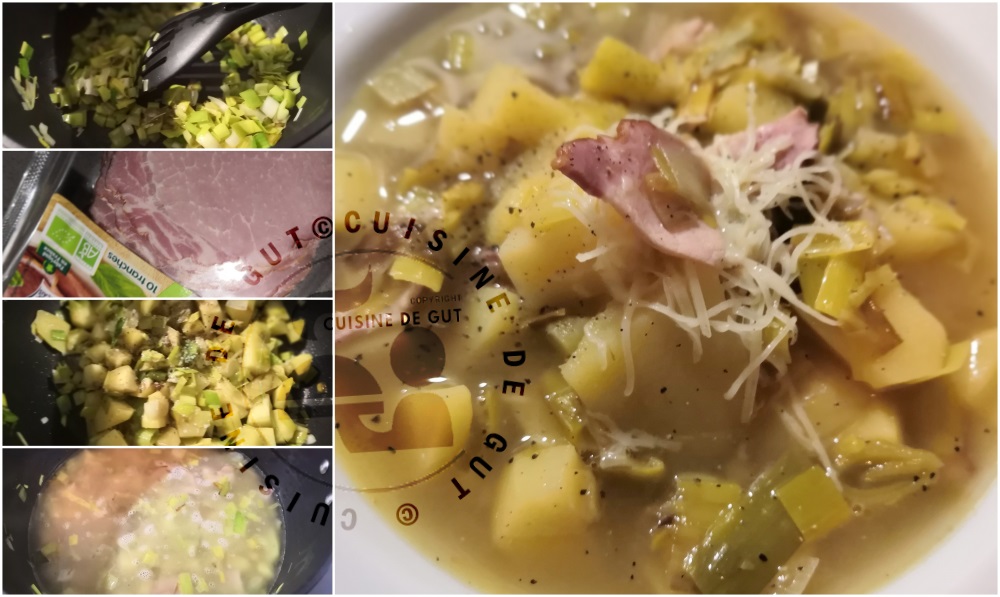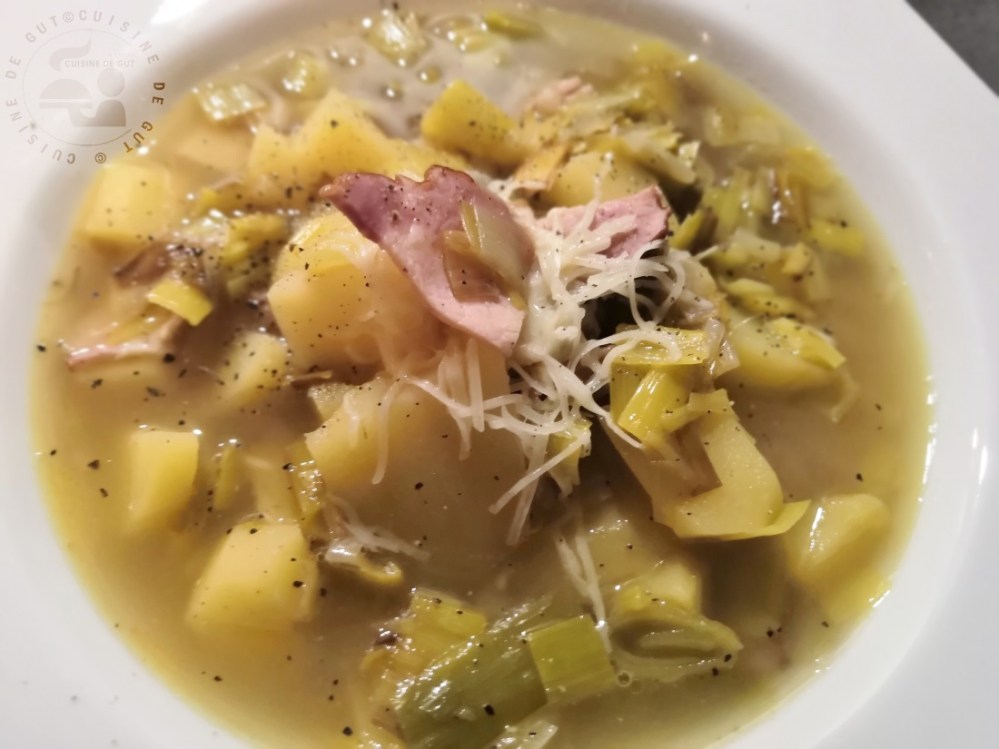 Le fait de faire pré-cuire les poireaux et les pommes de terre avant d’ajouter l’eau de cuisson change tout ensuite ! On se retrouve avec une soupe plus que délicieuse. Bien sûr il faut aimer le poireau mais quand c’est le cas je vous promet un bon moment de gourmandise et pourtant il s’agit d’un potage !! Je ne mets pas toujours du bacon mais là j’en avais à terminé et je dois dire que c’était un bon petit plus. Nous nous sommes encore une fois super bien régalés et j’ai envie de dire « mais bon sang comment ais-je pu oublier de publier cette soupe que je fais depuis plus de 40 ans » ! je n’oublierais pas alors de la publier pour cuisinons de saison