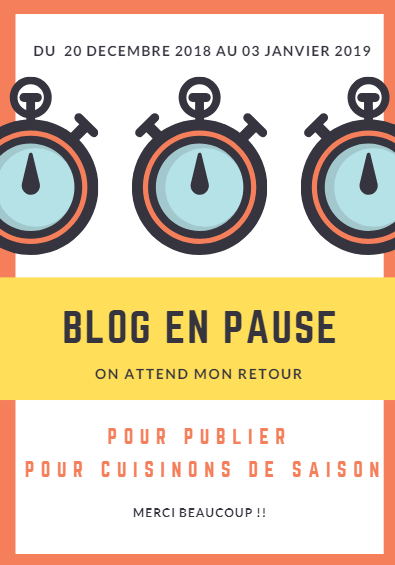 Durant mon absence, je vous demanderai de vous abstenir de publier pour cuisinons de saison car il y a beaucoup de recettes journalières et j’en aurais beaucoup trop à mettre à jour à mon retour. Merci d’avance !