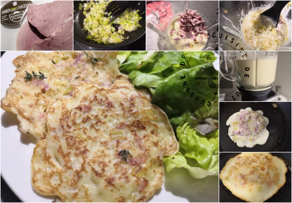 Eplucher les poireaux, les laver et les couper dans la longueur en 4 puis les couper en rondelles Chauffer une poêle sur feu moyen avec le beurre et l’huile d’olive. Faire cuire les poireaux durant 5 minutes. Saler et poivrer. Ajouter le vin blanc et continuer la cuisson pendant 5 minutes à couvert sur feu doux puis réserver Mettre la farine dans un blender, ajouter l’oeuf et le lait. Mixer- Ajouter le jambon préalablement coupé en morceaux, les poireaux, le fromage râpé, et un peu de thym frais effeuillé. Rectifier l’assaisonnement
