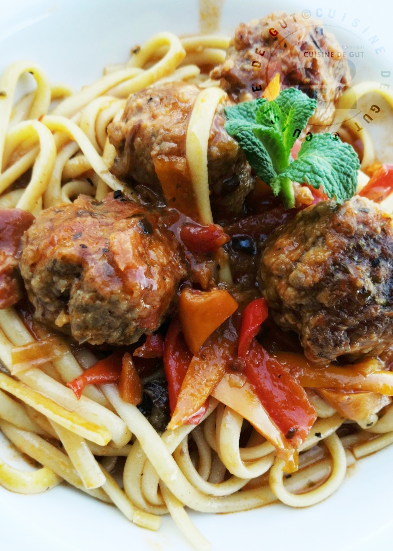 Published at 785 × 1100 in Boulettes d’agneau aux poivrons sauce tomates aux cèpes