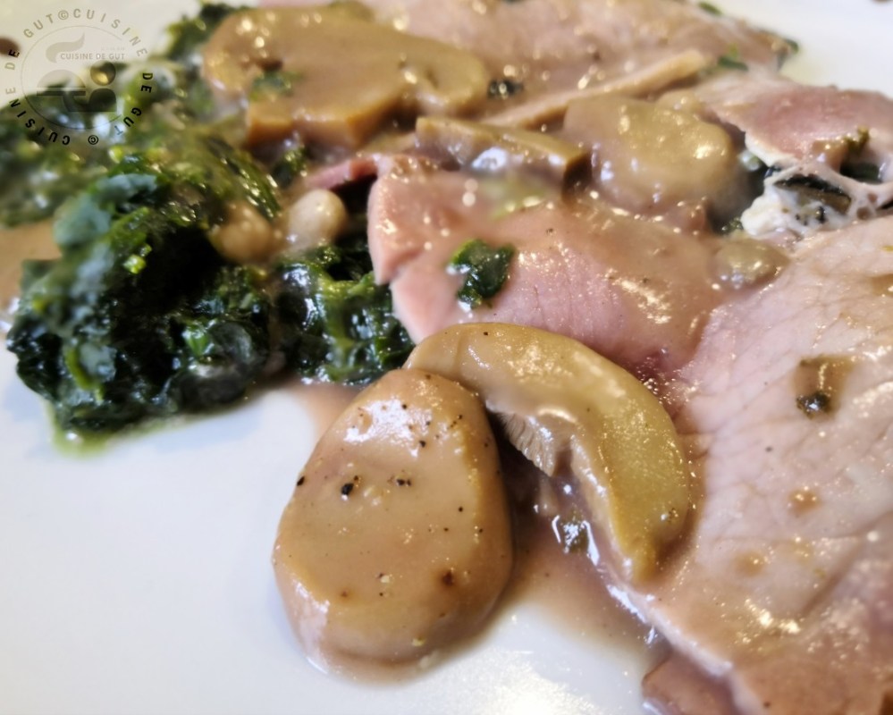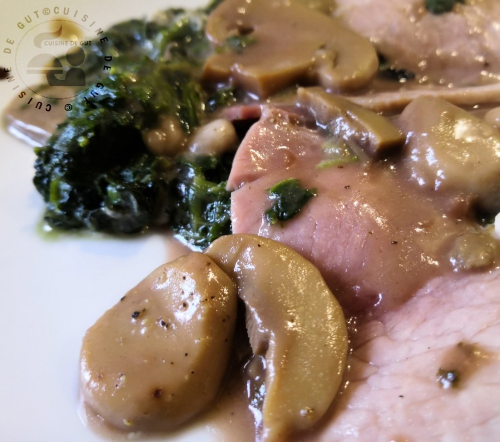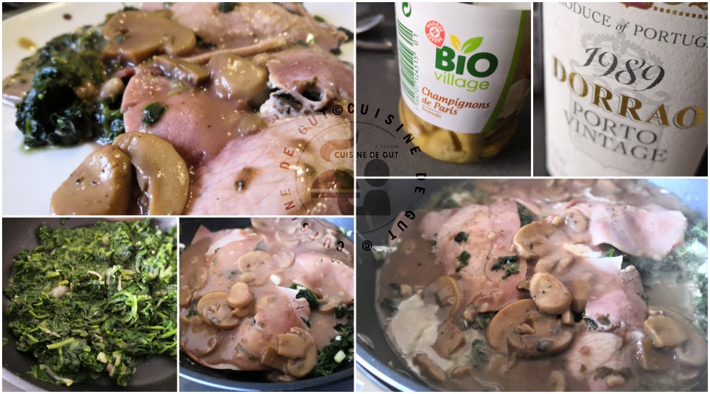 Je me régalais habituellement avec ce plat mais là je dois dire que c’était plus que du régal ! le parfum de la truffe qui se mélangeait avec celui de ma super sauce au porto, c’était divin ! Ce plat peut vraiment faire un plat d’exception aux fêtes croyez moi si vous avez la chance de trouver comme moi ce bon jambon truffé ! Dire que j’ai fait ce plat pour faire quelque chose de simple et rapide à faire ! Remarquez, ça l’est car la réalisation de ce plat tel que je le propose aujourd’hui,  c’est, en fait, juste la réalisation de la sauce ! Je n’ai pas eu à équeuter et laver les épinards et je n’ai pas eu à peler les champignons ! Une fois la sauce faite, on laisse mijoter et voilà, donc oui pas grand chose à faire avec ces épinards surgelés mais …… en choisissant des produits d’exception alors on se retrouve avec un plat royal !