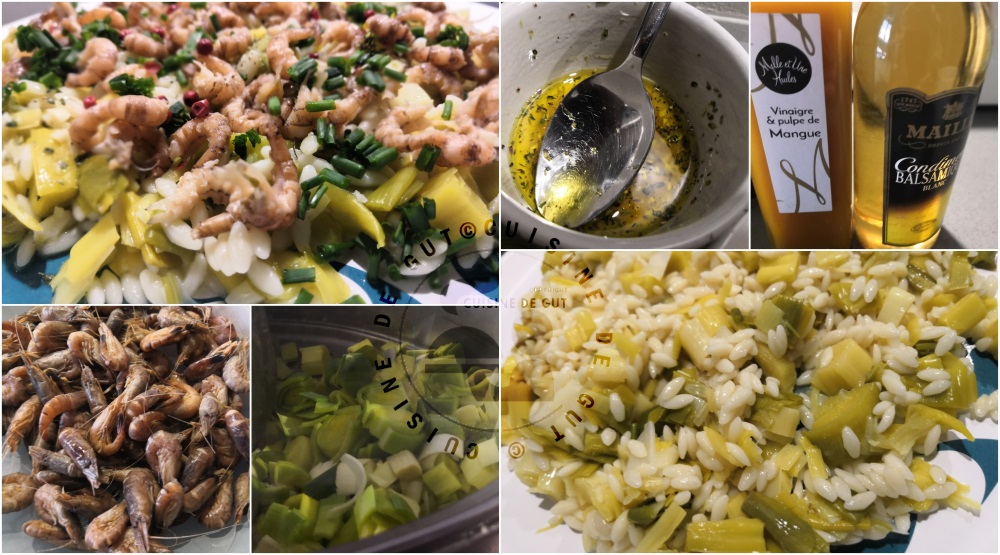 Tout d’abord désolée pour mon silence de ces derniers jours, mais j’étais trop occupée pour passer vous voir et pour publier, je vous ai donc abandonné(e)s et n’ai assuré que les publications pour cuisinons de saison. Je vous prie de m’en excuser.. Me revoici donc avec un petit plat auquel je n’ai pu résister. Il vient tout droit de chez mon amie Martine (Kilomètre-0.fr) qui a le courage de pêcher ces petites crevettes grises alors qu’en ce moment l’eau est glaciale ! Faut le faire, moi je lui tire mon chapeau !! j’adore autant ces crevettes que Martine, mais si elle a l’habitude de les proposer avec toutes sortes de plats, j’avoue que j’ai plus l’habitude de les manger comme ça avec seulement un peu de pain et du beurre salé…. J’ai voulu faire une exception avec ce plat en me disant qu’il ferait un super petit plat du soir ! Comme j’achète des crevettes grises toutes les semaines, que j’adore les poireaux et que j’avais à ma disposition des Puntalettes, (petites pâtes en forme de grain de riz qui portent aussi le nom d’ Orzo, Risoni, Riso, Risone, Puntine ou langues d’oiseaux ), il m’a été facile de refaire ce petit plat ! J’ai juste modifié la vinaigrette, mis de la ciboulette à la place du persil et j’ai ajouté des baies roses ! j’en raffole en ce moment !