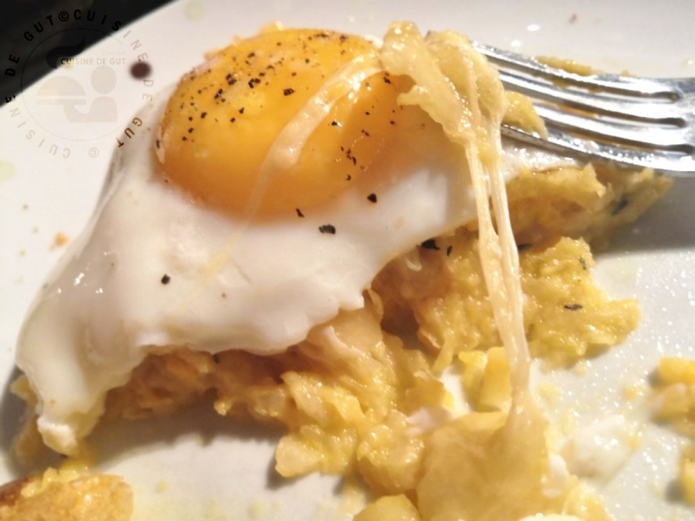 Le soir, je lui ai jouté un peu de lait pour que ce soit un peu moins compact, je l’ai étalé dans un plat à gratin, ajouté du râpé d’Abondance et j’ai fait cuire un oeuf au plat que j’ai disposé à cheval sur chaque portion ! Moi qui aime le fromage je pense que je me suis encore plus régalée encore que le midi. Je n’aime pas manger la même chose deux fois de suite mais pour une fois je ne m’en suis pas plainte bien au contraire ! Je vais donc ajouter ces deux photos sur cuisinons de saison !