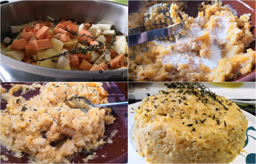 Nous avons dégusté le midi cet écrasé de légumes avec une petite escalope de veau à la crème. C’était le céleri qui ressortait car sa saveur est puissante mais le petit goût sucré de la patate douce l’a adouci et ce petit côté sucré mélangé à la saveur de thym que j’avais mis pour parfumer cet écrasé, c’est révélé vraiment très bon.