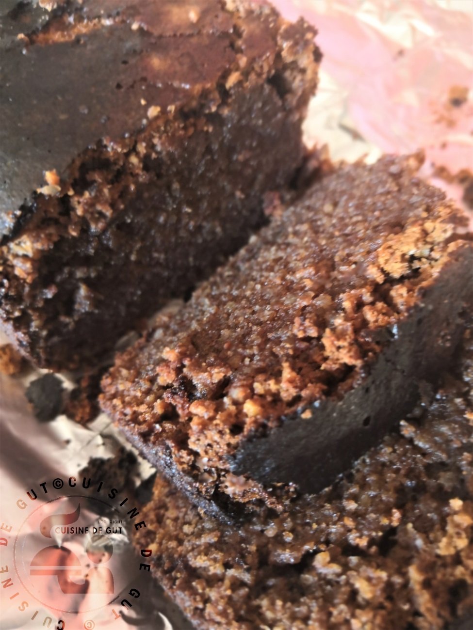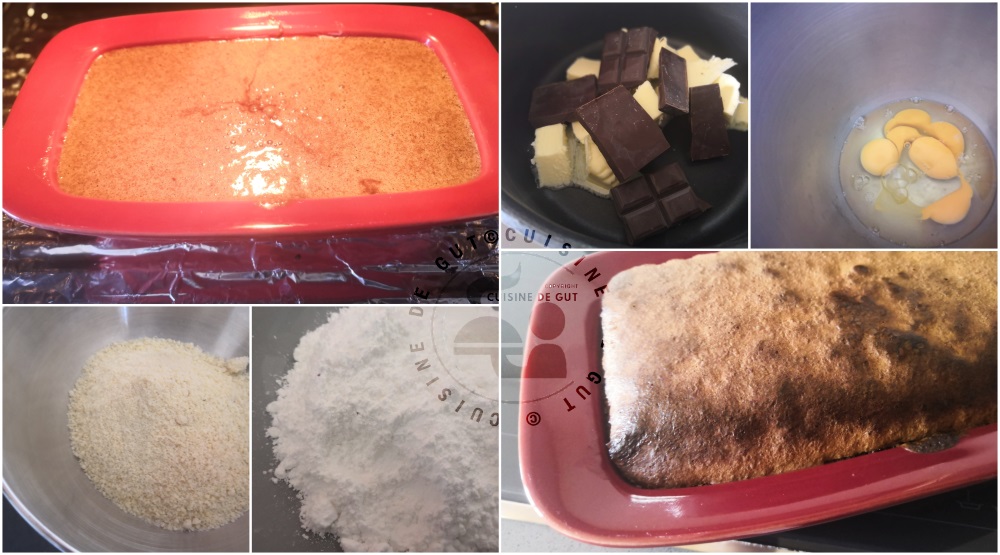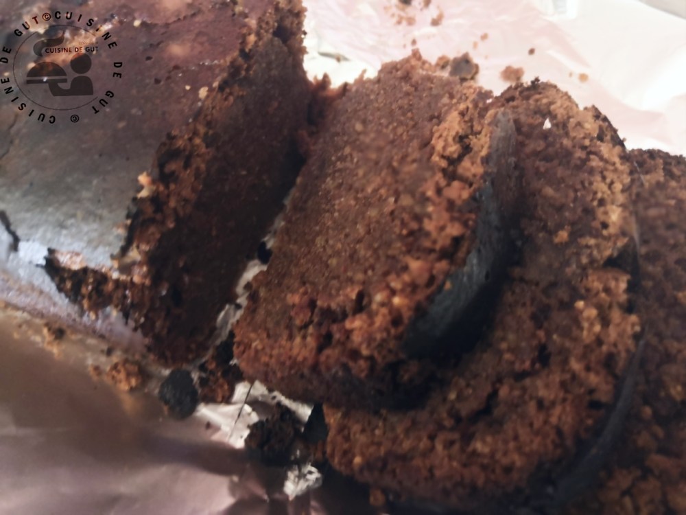 J’ai eu beaucoup de mal avec la cuisson car ayant utilisé un moule à cake il était donc épais et les 30 minutes préconisées n’ont pas suffi ! En plantant la lame du couteau je me suis rendue compte qu’il n’était pas cuit du tout. Je l’ai donc fait cuire 15 minutes de plus puis je l’ai laissé dans le four éteint. Le souci est que comme une andouille je n’ai pas remis la feuille d’alu dessus alors il est devenu vraiment bien noir ! Il est vraiment important d’indiquer lors d’une recette de gâteau la grandeur du moule utilisé ca change du tout au tout les cuisson et même les visuels. Je n’ai pas regretté cet essai car je l’ai bien aimé ! Il était bien moelleux avec un bon goût d’amande et pas du tout bourratif comme c’est souvent le cas je trouve avec les gâteaux au chocolat. Toutefois je n’en ai pas mangé beaucoup car ce n’est toujours pas ça que ça mais bon je me suis fait plaisir et j’ai énormément fait plaisir à Monsieur Gut ! Merci Marion