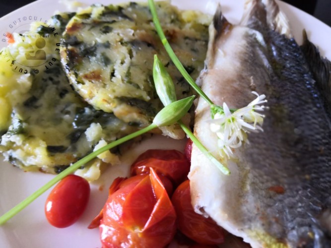 Published at 1300 × 975 in Bar et Galette de purée à l’ail des ours