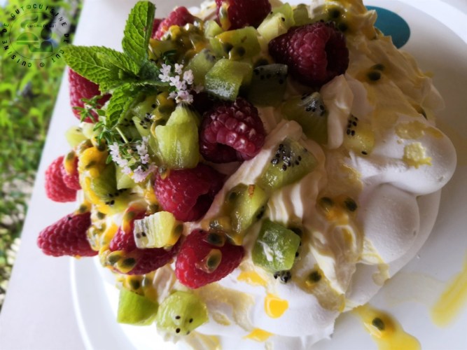 Published at 1300 × 975 in Pavlova framboise kiwis ganache fruit de la passion
