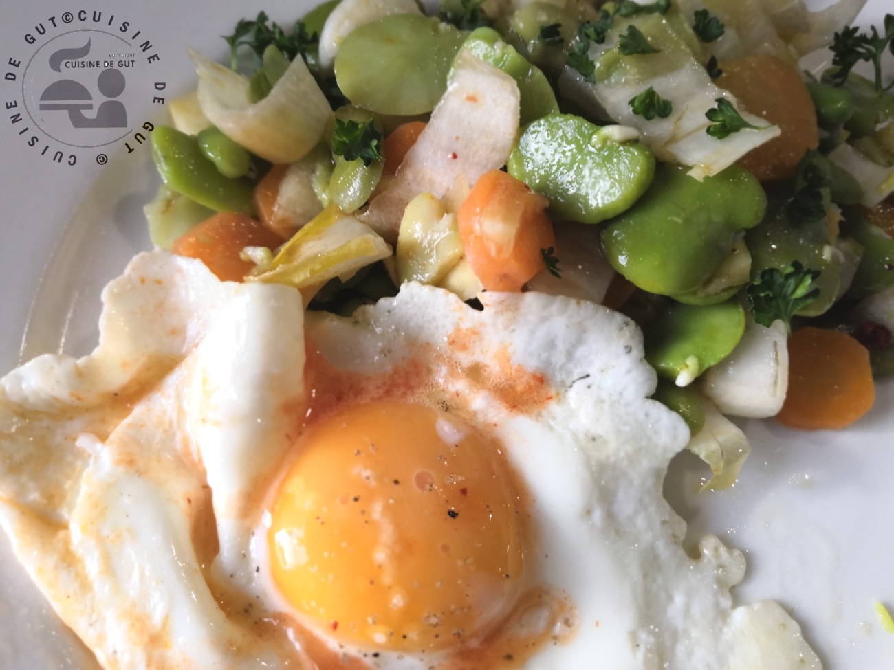 Published at 1300 × 975 in Oeuf au plat aux fèves carottes et endives