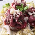 Published at 1300 × 975 in Carpaccio de boeuf au pesto sur toast grillé, caviar d’auvergines et poivrons