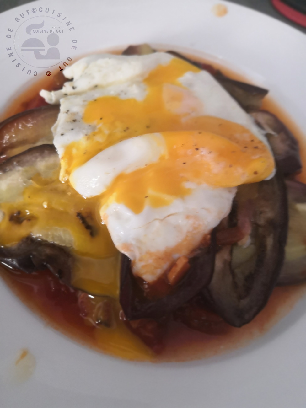 Perso, cela ne me choque pas que l’œuf soit crevé sur la photo, déjà cela la personnalise et, entre nous Gut, crois-tu être la seule au quotidien à servir l’œuf sur le plat crevé !?!? De plus, je la trouve gourmande du fait que le jaune s’étale sur les aubergines 😉