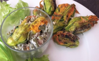 Fleurs de courgettes farcies haricots verts et crevettes grises1