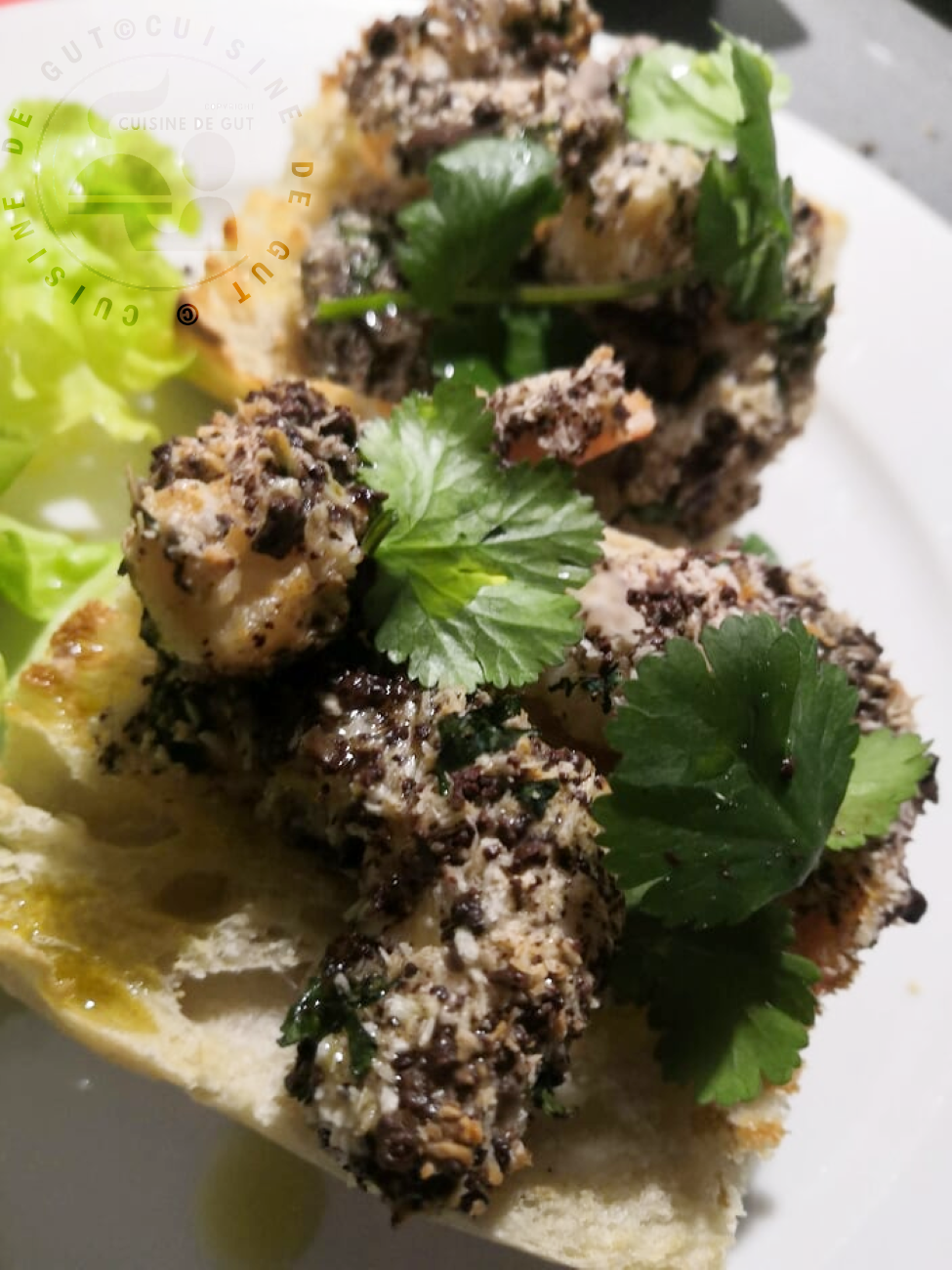 Published at 975 × 1300 in Bruschetta de crevettes coco et chocolat