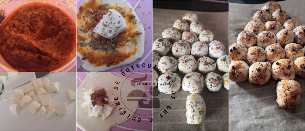 Lorsque vous formez les boules, faites en sortes de bien enfermer le contenu pour qu’il ne s’échappe pas à la cuisson ! Mettre les plis en dessous des boules. Surveillez la cuisson ! les boules doivent être dorées ! Vous pouvez bien entendu varier les garnitures !!