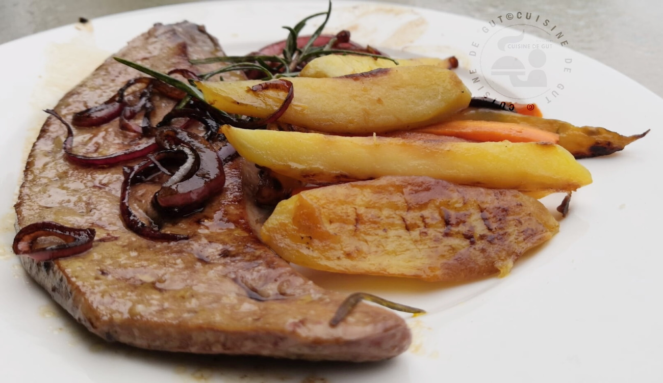 Foie de veau aux oignons rouges et son accompagnement parfumé ail et romarin