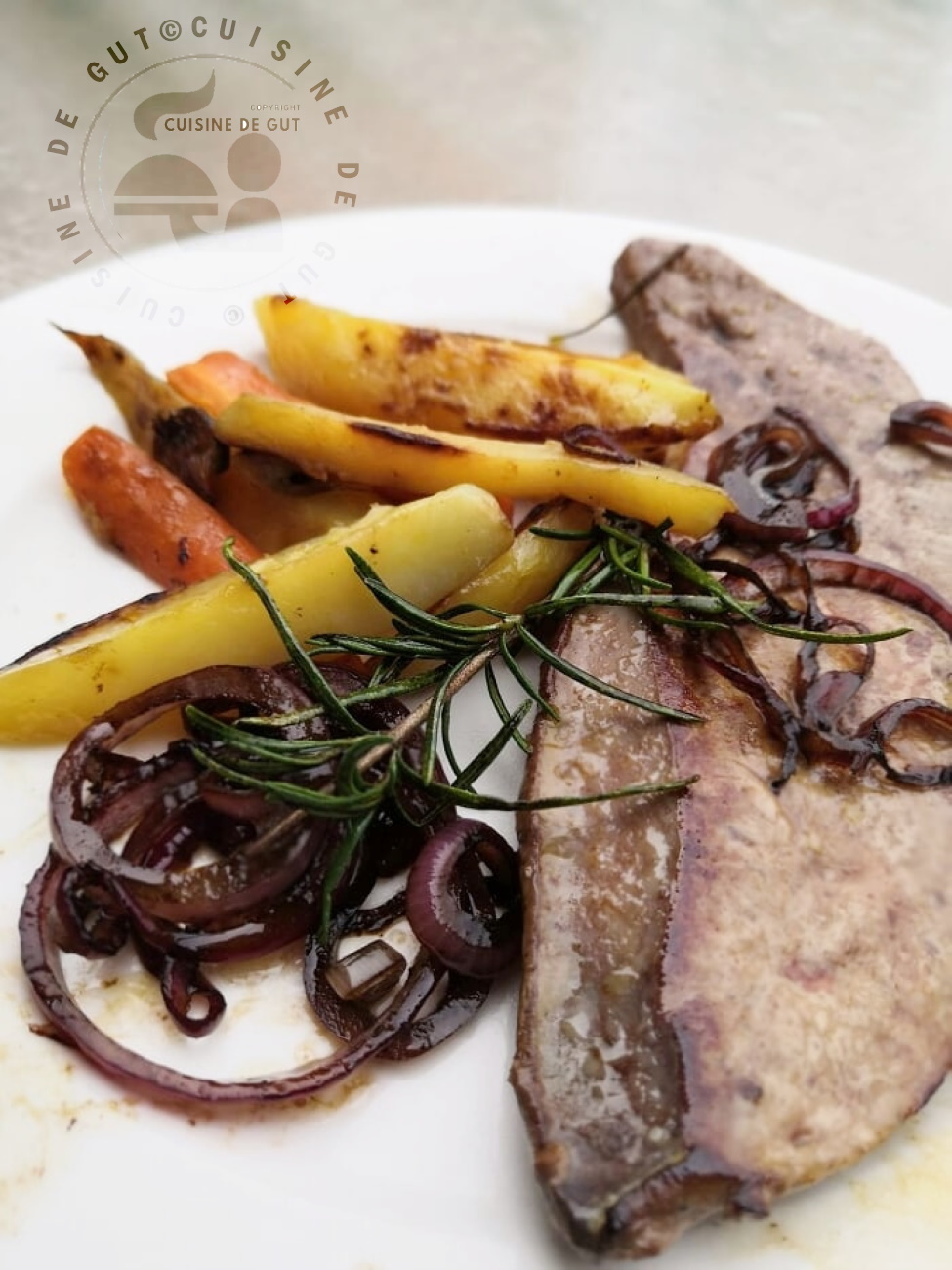 Published at 975 × 1300 in Foie de veau aux oignons rouges et son accompagnement parfumé ail et romarin