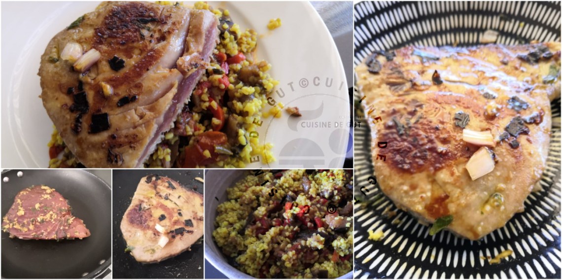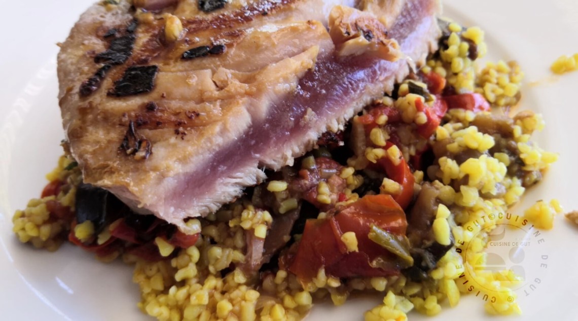 Extra ! Il n’y a pas d’autre mot. Que j’aime ce poisson lorsqu’il est cuit ainsi. Il est fondant comme tout c’est un réel plaisir de dégustation. Avec cette petite marinade, il ne manquait pas de saveurs et comme je m’y attendais, il s’est révélé super pour accompagner ce reste de boulgour au curcuma et d’une compotée d’aubergine, tomate et poivron rouge. Ces légumes ne sont pas de saison mais j’avoue qu’en ce moment je prends ce que je trouve… Je suis contente car si je n’avais pas eu ce reste de légumes je n’aurais peut être pas songé à le faire pour accompagner ce thon mais le tout s’est vraiment bien marié ! C’est à refaire, mais cette fois exprès, lorsque je recevrais par exemple. Je me servirais alors de ma plancha, ce ne sera que meilleur encore !