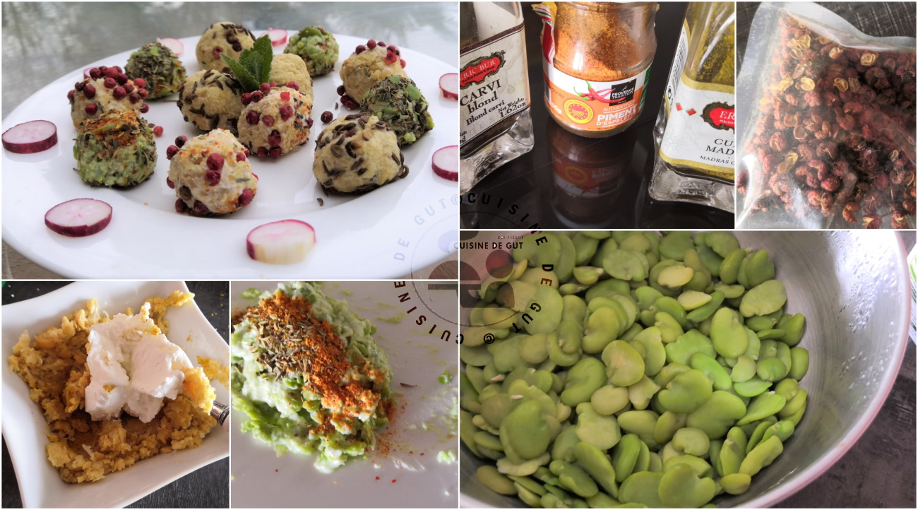 Puisqu’il faut que ça roule, sur le CMUM du mois d’avril, avec le thème que j’ai choisi en tant que marraine : Oup’s la boulette, je vous propose aujourd’hui un petit apéro ! J’aime bien proposer des petites choses à grignoter maison avec un petit verre mais j’aime bien changer et ne pas manger toujours la même chose. Cette fois, je me suis dit qu’en réalisant des petites boulettes de fromage frais, ce pourrait être très sympa. C’est toujours le confinement, alors j’ai fait avec ce que j’avais et pas de trop car nous n’étions que tous les deux pour les manger et pour trinquer. J’ai tout de même voulu varier les saveurs. J’ai donc choisi comme base le fromage frais, que j’ai associé pour certaines boulettes, à la fève vu que ça avait bien marché pour mes boulettes de thon aux fèves oeufs durs combava et aneth, et pour les autres j’ai mélangé le fromage mais en plus petite quantité avec une purée de pois chiches. Pour les parfumer j’ai sorti sur ma table : des baies roses, des graines de carvi, du curry Madras, du piment d’Espelette, du poivre Timut du Népal et des herbes de Provence. Tous d’excellents parfums qui ne manqueraient pas de bien parfumer ce fromage qui seul était je l’avoue plutôt fade ! Ca ne vaut pas le Chavroux celui ci n’a aucun goût !