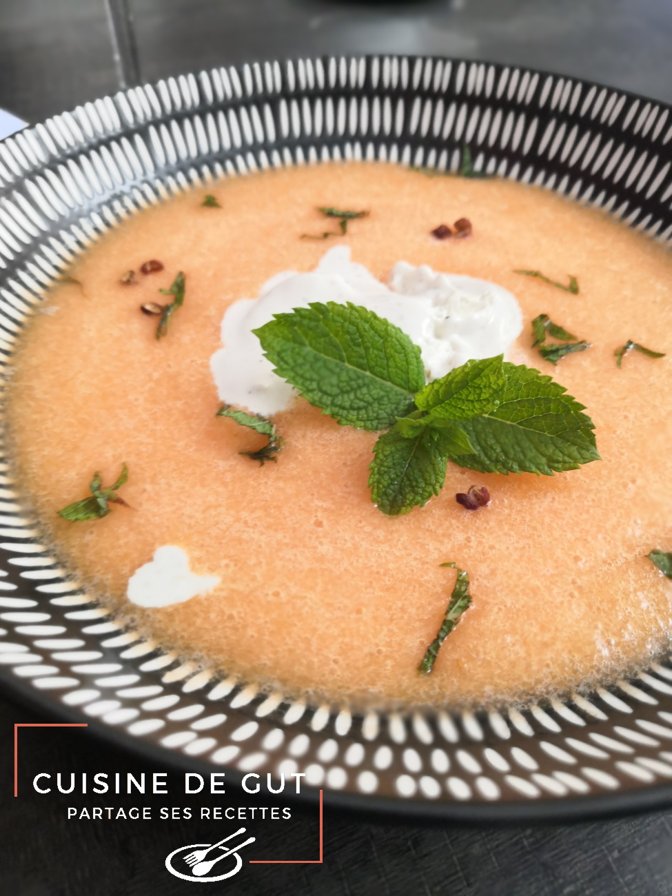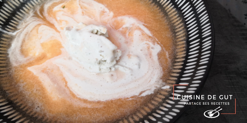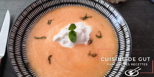 Pas sûr du tout que j’aurais fait ce plat sans le thème du CMUM de ce mois de Juillet ! c’est chouette les défis car ça nous pousse à faire des choses innovantes ! Ce gaspacho est une entrée des plus sympathique ! Même les récalcitrants au fromage aimeraient car le poivre Timut et la menthe ont bien parfumer la crème qui s’est divinement bien mariée au melon anisé ! L’anis a fait ressortir le sucre du melon franchement c’était délicieux. J’ai adoré. Pour une entrée lorsque l’on reçoit c’est parfait, on fait la préparation la veille et il n’y a plus qu’à faire la crème glacée quand tout le monde s’installe à table ! le top ! Je suis heureuse de dédier ce plat à cuisinons de saison pour illustrer le melon !