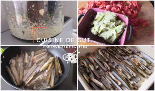 Surveillez la cuisson ! il ne faut pas que les couteaux ne brûlent ! Surtout prenez soin de bien nettoyer les couteaux pour bien évacuer tout le sable qu’ils contiennent . Les 80 gr de beurre étaient nécessaires pour le mixage car mon bol multi fonction est grand mais c’est beaucoup trop je trouve pour le répartir sur les coquillages alors si vous n’avez qu’un petit mixeur n’hésitez pas à diminuer la quantité de beurre
