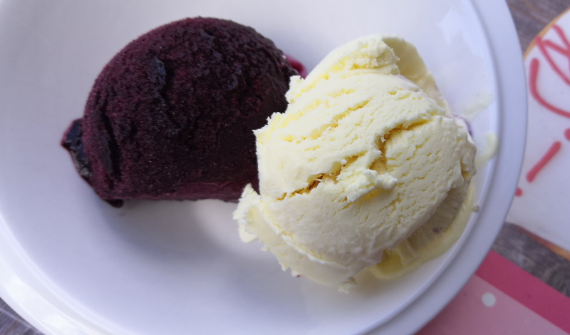Je ne connaissais pas cette machine alors je suis allée voir. Effectivement c’est une machine de pro mais outre le prix qui est effectivement très cher, je sais que pour moi, ce n’est pas la solution qu’il me faut car je ne reçois pratiquement plus et pour nous deux et pour le peu que nous mangeons des glaces ce ne serait pas utile. Alors si c’est juste pour les vacances des enfants je peux continuer de faire comme je fais : les préparer à l’avance à mon rythme. Pour mes sorbets ça ne pose vraiment aucun problème car la texture est idéale, je n’ai même pas besoin de sortir la boite avant la dégustation, même si elle a été faite 1 mois avant la dégustation. Je peux ainsi faire de plusieurs parfums et jouer les marchands de glace ! 😉 Oriane adorait lorsqu’elle était plus petite, prendre la commande de chacun. Je la revois encore. Je préparais une petite carte avec les parfums disponibles et elle passait auprès de tout le monde en présentant sa carte puis elle prenait commande avec un carnet et un stylo pour noter les choix.