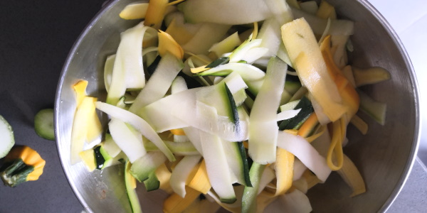 - Laver les courgettes puis les tailler en tagliatelles, avec un économe rasoir dans un saladier