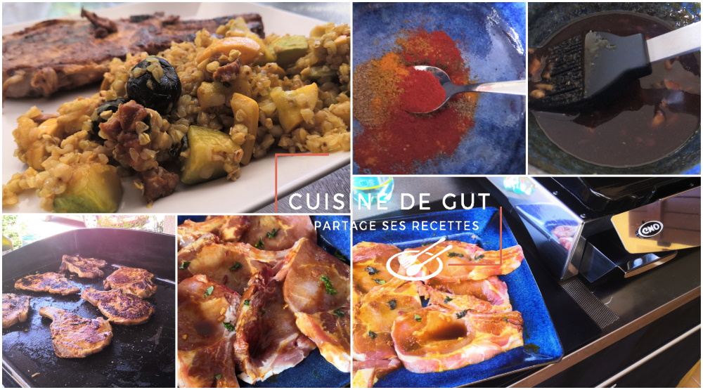 J’avais trouvé parfait de faire ce plat avec une petite plancha de côtes de porc avec la marinade de Laurence qui était très épicée puisqu’elle contenait 5 épices.