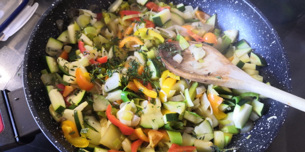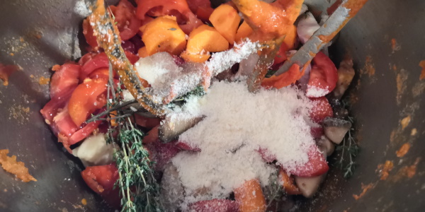 - Ajouter le thym frais poursuivre la cuisson jusqu’à ce que les légumes soient pratiquement cuits.