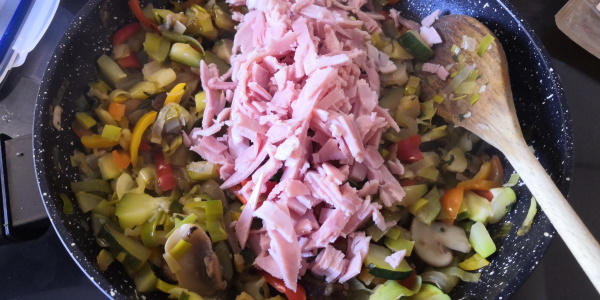 - Couper le jambon en petits morceaux et les ajouter aux légumes