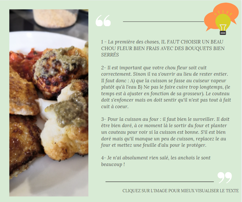 Une très belle façon de cuisiner le chou fleur mais je passe mon tour car je n’aime pas les anchois