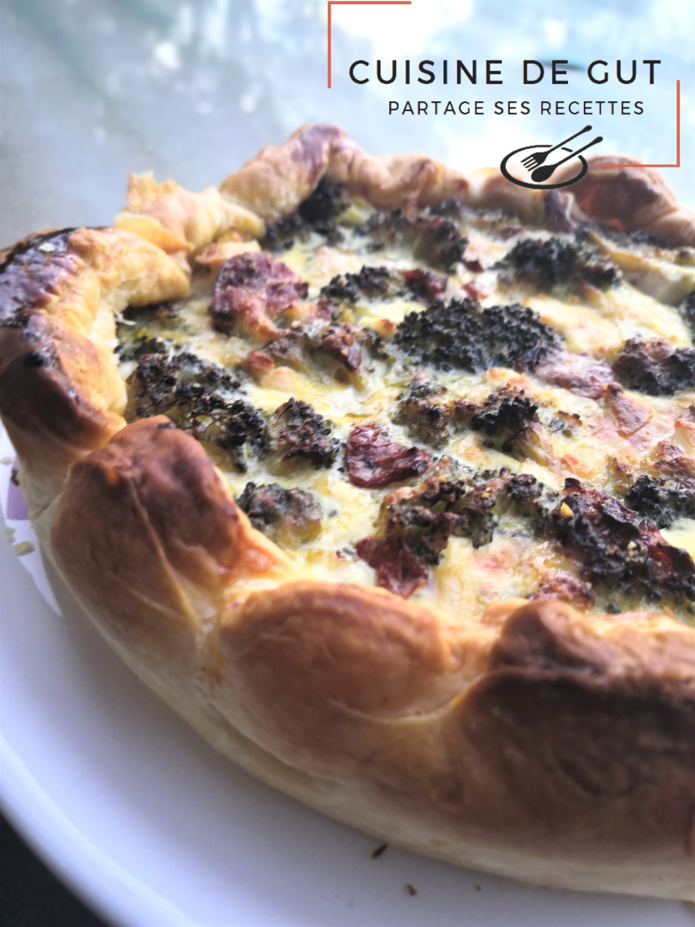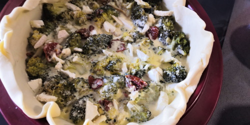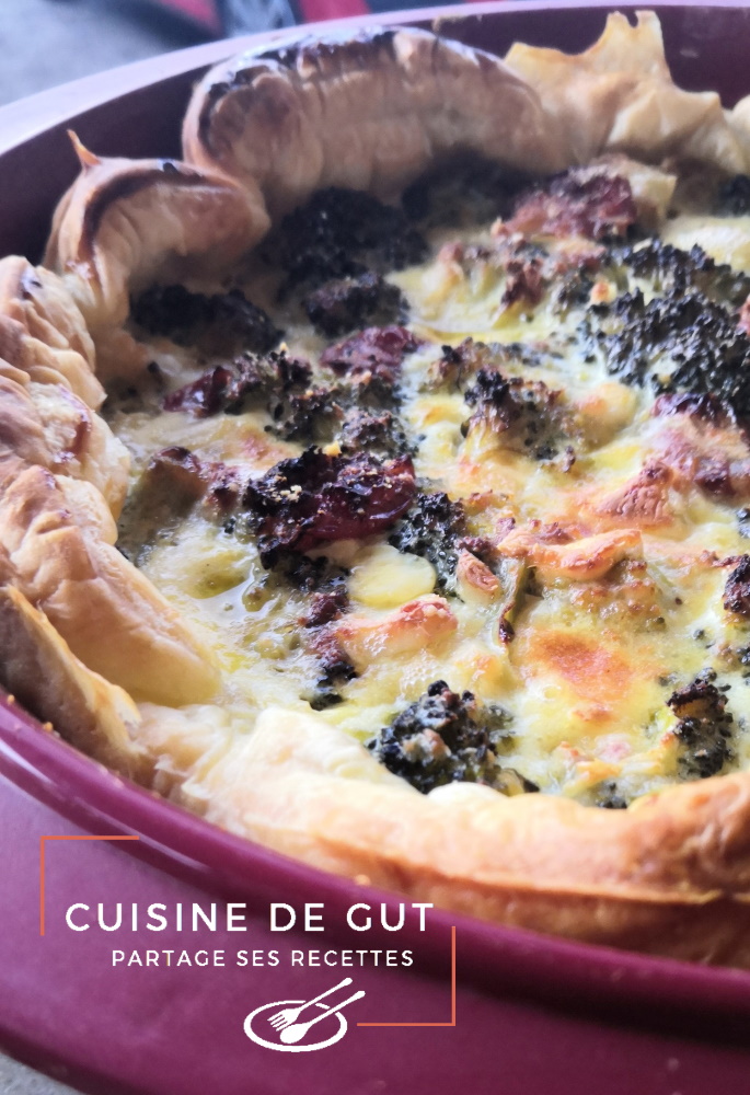 Normalement lorsque l’on est tous les deux je fais des tartelettes individuelles mais là je voulais en faire aux brocolis et le brocolis c’est assez gros alors à moins de le réduire pratiquement en purée ça n’aurait pas été. Du coup j’ai réalisé une grande tarte. Ca nous fera pour 2 repas ! Contrairement à beaucoup je ne fais pas cuire mes brocolis ni à l’eau ni même à la vapeur, je les fait cuire dans une sauteuse, avec un léger filet d’huile et à couvert.