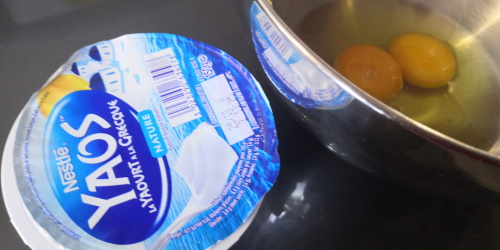 - Battre les oeufs avec le yaourt grecque et 10 cl de lait. Saler et poivrer