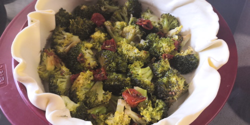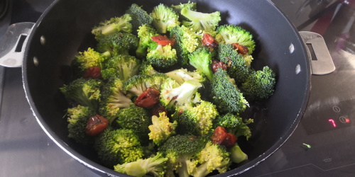 - Ajouter dessus les bouquets de brocolis puis les tomates confites