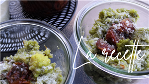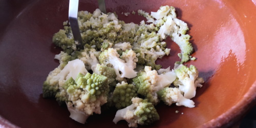 J’ai donc fait cuire mon chou Romanesco à la vapeur, je l’ai écrasé et je l’ai mélangé avec quelques tomates confites, du parmesan et j’ai salé le tout avec du sel de Guérande à la Spiruline de mon partenaire le Goût de nos régions.