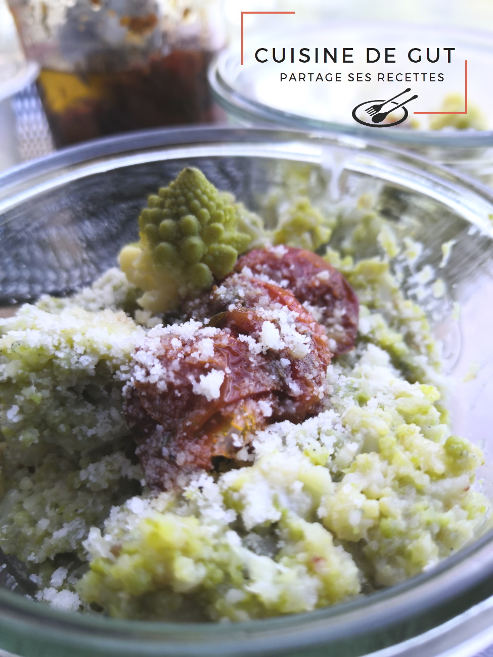 S’il y a un chou qui n’est pas trop cuisiné c’est le chou Romanesco. Je ne sais pas pourquoi, personnellement je l’aime bien, il m’a toujours bien régalé surtout dans mes lentilles corail, butternet et chou romanesco au cidre. Récemment, j’ai fait pour la dernière fois cette année, un gros bocal de tomates confites. J’en mets en peu partout en ce moment pour en profiter jusqu’au bout alors j’ai eu envie de les marier avec du chou Romanesco.