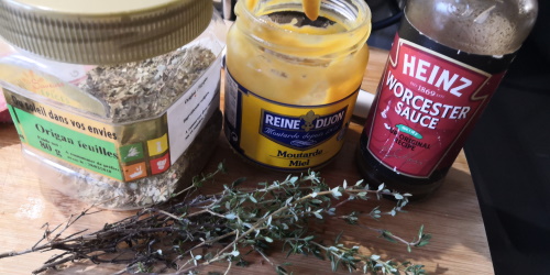 J’avais racheté des petites tomates cerises pour les faire confites (même si elles ne sont plus de saison, c’est plus fort que moi j’adore ça). J’en ai donc ajouté quelques unes pour réaliser mon travers. j’ai réalisé une petite marinade avec de la sauce Worcester et de la moutarde au miel et j’ai badigeonner mon travers avec. Il n’y avait plus qu’à ajouter des herbes et mettre tout ça au four !