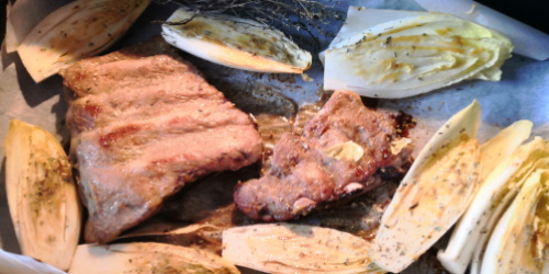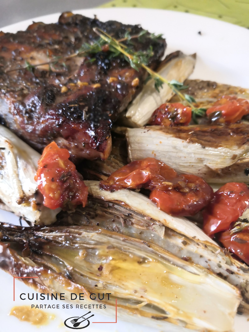 Travers de porc confit au four, endives et tomates confites