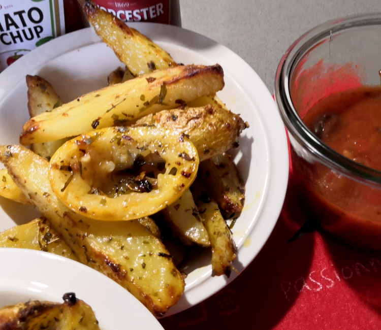 Eh bien voilà que je mange à l’Américaine moi et en plus je me suis régalée ! Ces pommes de terre étaient super fondantes et terriblement parfumées. Quant à l’idée de la sauce, que j’ai eue grâce au fait qu’il fallait une couleur rouge sur la photo, était fort bonne. Nous les avons trempées dans la sauce, comme on l’aurait fait avec des frites, c’était super et ces pommes de terre se sont super bien mariées avec ma pièce de boeuf !