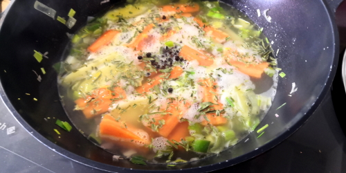 - Diluer le fumet de poisson dans de 20 cl d’eau et l’ajouter dans la sauteuse, poursuivre la cuisson.
