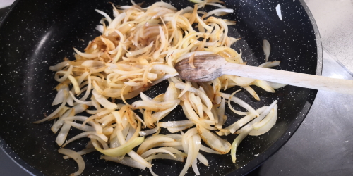 - Remplacer par les oignons et les faire revenir également jusqu’à ce qu’ils soient translucides. Remuer souvent pour ne pas qu’ils ne brûlent.