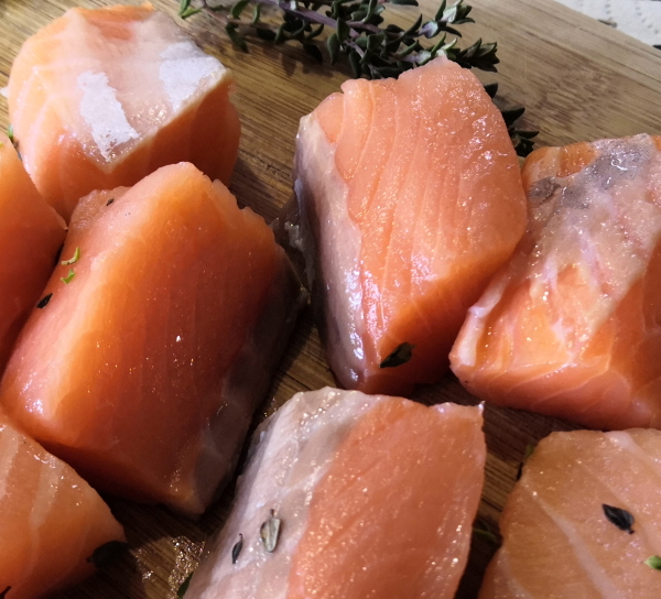 - Bien éponger les morceaux de saumon avec un Sopalin et les couper en gros cubes sans la peau. Réserver