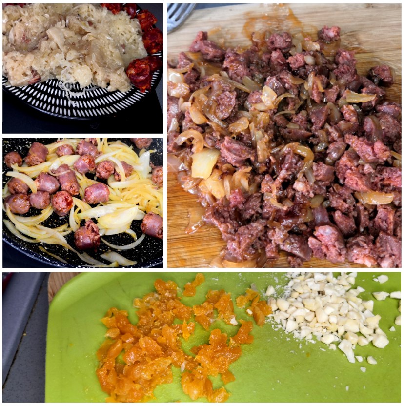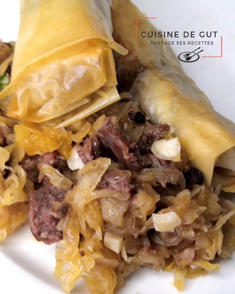Parfois je me demande d’où me vient mes idées car certaines sont un peu curieuses.. comme celle que je vous propose aujourd’hui. Voici comment elle m’est venue. Il me restait des feuilles filo de ma Mhancha salée aux légumes épicés que j’avais mise sous vide pour les conserver. En cherchant quelle farce je pourrais faire, je suis tombée sur un reste de choucroute que j’avais faite avec du lapin. Tiens tiens pourquoi pas ? ceci dit ça ne me plaisait qu’à moitié, il me fallait quelque chose d’autre pour aller avec. Les merguez m’ont traversé l’esprit. Allez tant pis j’ose ! Je les ai donc sorties du congélo. Un peu plus tard je me suis dit tout de même que mon idée était peut être culottée et lorsque je l’ai soumise à Mr Gut, il a vraiment écarquillé les yeux.