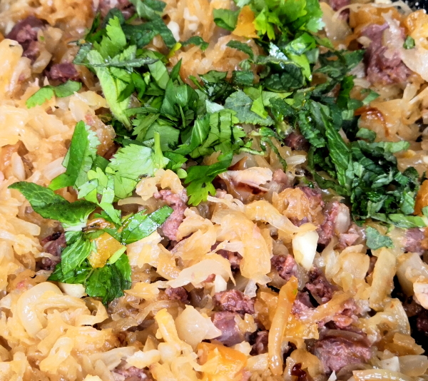 Comme je vous l’ai laissé entendre dans mon intro, oui cette recette vaut le coup ! C’était franchement délicieux. Certes curieux, je vous le concède mais néanmoins super bon. La choucroute et la merguez ça fonctionne bien et le sucré de l’abricot est venu un peu retirer l’acidité de la choucroute. Les parfums avec la coriandre et le poivre Timut ont super bien joué leur rôle. J’ai vraiment regretté ne pas avoir pu faire de magnifiques borek ou samoussa mais bon, pas grave, j’ai tout de même pu voir ce que cela pouvait donner au niveau du goût et c’était super réussi. Vous avez de la choucroute à terminer ? n’hésitez pas !