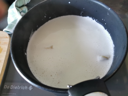 - Mélanger le lait et l’eau dans une casserole et faire chauffer.