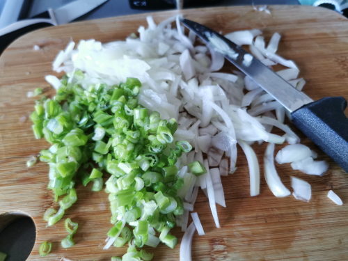 - Mettre les oignons ciselés et les tiges dans un saladier