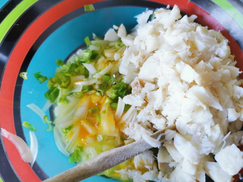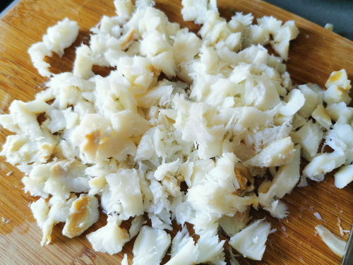 - Sortir les morceaux de morue à l’aide d’un écumoire et les laisser refroidir mais garder le lait/eau de cuisson.
