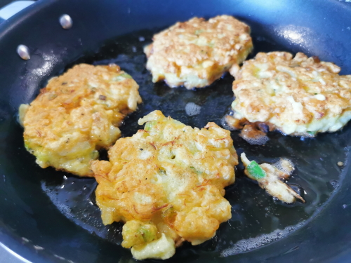 - Lorsque celle ci est chaude, ajouter des petits tas de la préparation et laisser frire quelques minutes de chaque côté.