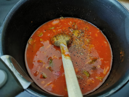 - Verser un peu d’eau dans la sauce tomate (qui a du épaissir), remuer et verser la moitié de la sauce sur les moules de chaque assiette